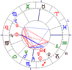 Besitzt Verständnis und Mitgefühl für Ängste und Schmerzen Nervengeplagter und Vergessener bei Einhaltung von heilsamem Abstand. Mars-Neptun-Kunjunktion im Quadrat zu Mond-Uranus-Konjunktion im 11. Haus im Krebs, Mond in Konjunktion zu Uranus